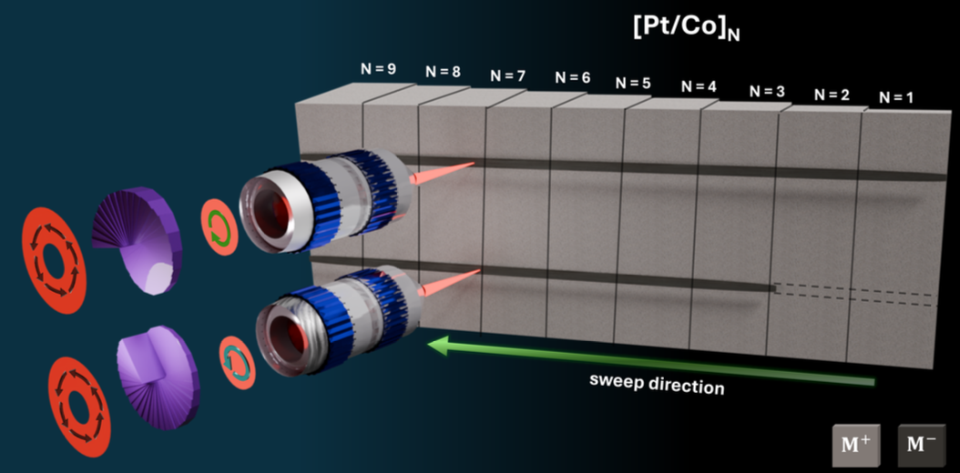 Paper Abstract: Ultrafast all-optical switching (AOS) in ferromagnets has emerged as a promising route toward dense and energy-efficient magnetic memory. However, its implementation has typically been limited by material-specific polarization requirements or by the need for auxiliary exchange coupling and compositional tuning. Here, we demonstrate that deterministic control of AOS can instead be achieved purely through optical engineering. By tailoring the polarization distribution and focusing of the excitation light, we shift the selectivity from intrinsic material properties to external beam shaping. In stand-alone [Pt/Co]𝑁 multilayers, this enables direct control over local heating and optical torques, allowing the system to be driven either into helicity-dependent, multishot domain-wall propagation or into helicity-independent magnetization reversal, without material modification or external bias fields. Our results establish optical beam design as a universal control knob for magnetization dynamics in ferromagnetic systems, defining a scalable pathway for integrating ultrafast spintronic functionality with on-chip photonics.